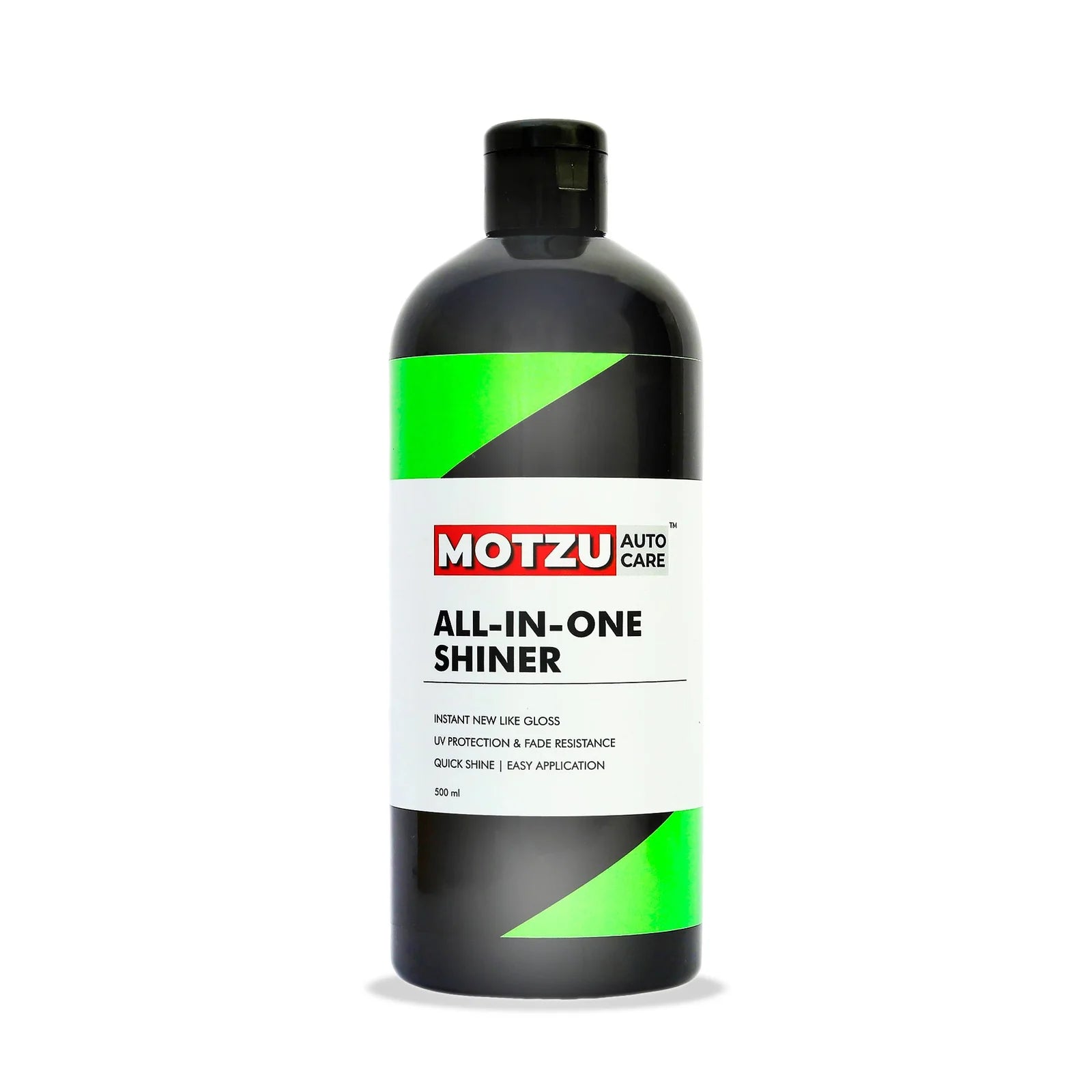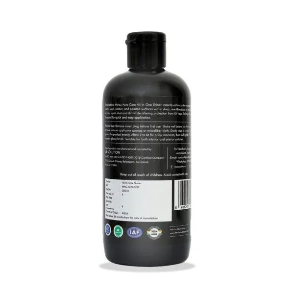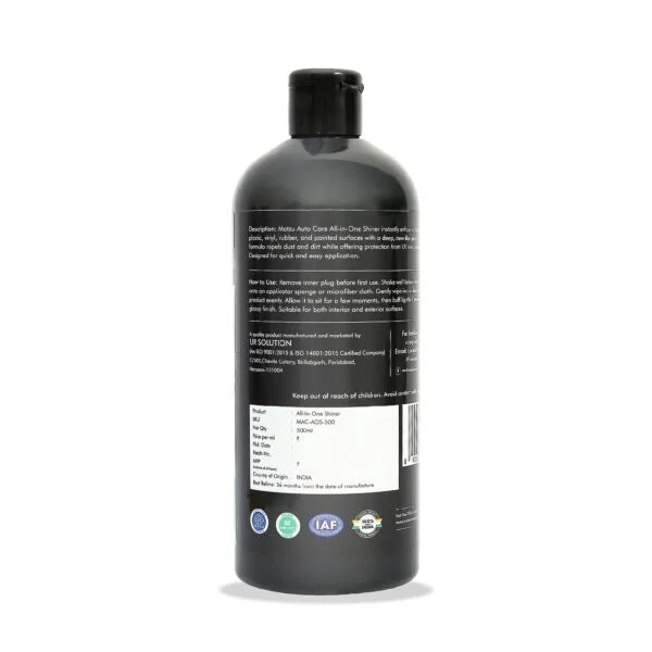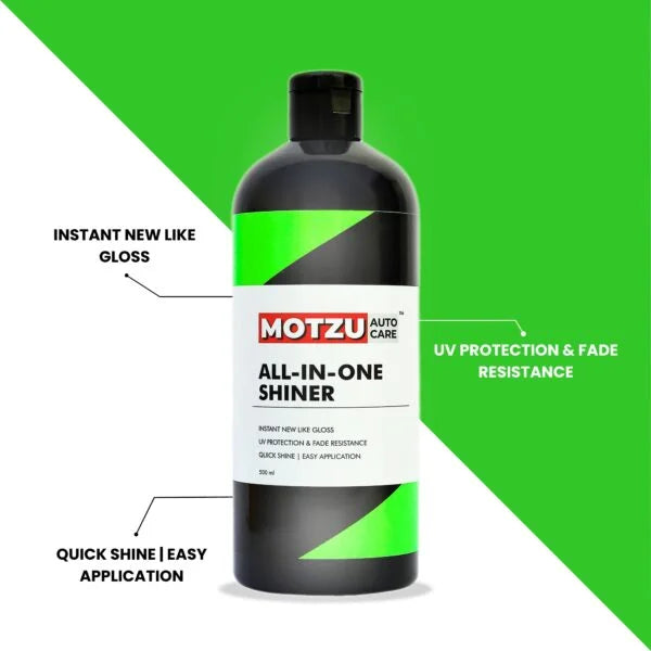 Motzu Auto Care All-in-One Shiner instantly enhances the appearance of plastic, vinyl, rubber, and painted surfaces with a deep, new-like gloss. Its non-greasy formula repels dust and dirt while offering protection from UV rays, fading, and cracking. Designed for quick and easy application, it restores shine and keeps surfaces looking fresh and protected for longer.