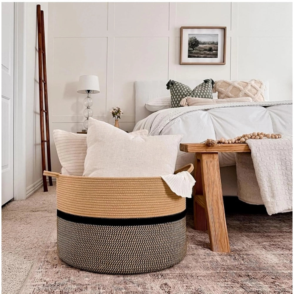 Cotton Dori 16x14 Inch Storage Basket For Clothes (Beige-Beige Black)