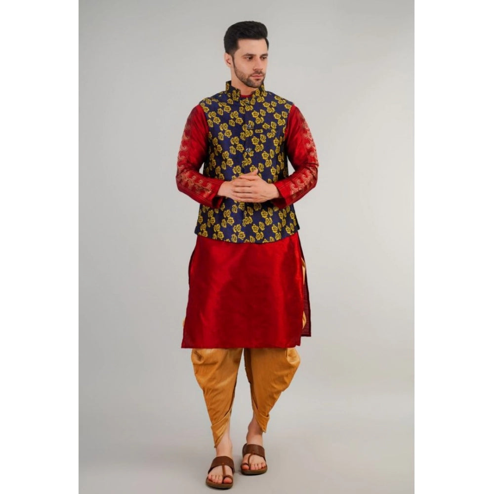 Generic Men's Jacquard Self-Design Sleeveless Mandarin Neck Waistcoat (Blue-Gold)
