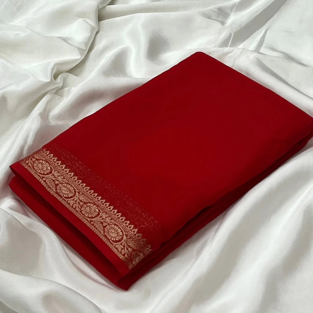 Women's Crepe Chit Pallu Solid Saree With Unstitched Blouse 5.5Mtr (Red)